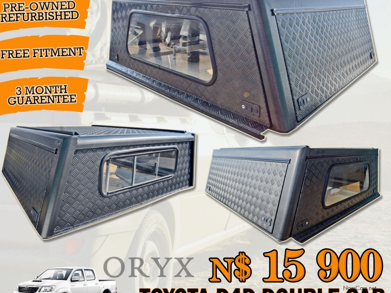 Description: Toyota Hilux D4D Double Cab ORYX Aluminium Canopy Brand : ORYX Color : Black Price : N$ 15 900 Fitment Included Status : Pre-Owned Refurbished Mobile Fitment can be done on your own premises - T's & C's Apply All our Refurbished Canopies we give 3 Month Guarantee! Contact us for all your Canopy Needs on 083 72 333 08 Dries on 081 712 77 06 Mardien 081 827 78 44 We are Located in Brakwater - Park and Sell Premises, Next to IN+GO Storage